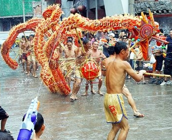 如今已發(fā)展成為對(duì)喜慶節(jié)日的慶祝,對(duì)美好生活祝福的一種方式。它用鮮棕葉作龍須,用葛藤、黃荊條、松樹枝作龍身,分9節(jié)、11節(jié)、1 3節(jié)、15節(jié)等不同長(zhǎng)度的奇數(shù),由9至15人參加舞龍。伴著鑼、鼓、鎖吶的鏗鏘樂(lè)曲,一人持“寶”在前,龍舞歡騰時(shí)有“二龍搶寶”、“蛇蛻皮”、“烏龍絞柱”等50多種動(dòng)作玩法。與此同時(shí),身著民族服裝的群眾用臉盆、水瓢、銻桶等容器端水圍繞著龍潑澆,這樣邊舞邊潑水、水潑得越多龍舞得越歡,也預(yù)祝大家當(dāng)年風(fēng)調(diào)雨順,五谷豐登,其場(chǎng)面歡樂(lè)喜慶,風(fēng)趣幽默。已列入我市第一批非物質(zhì)文化遺產(chǎn)保護(hù)名錄。
