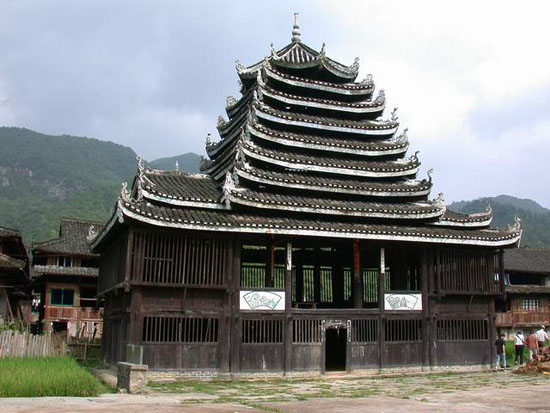 位于通道侗族自治縣坪陽鄉(xiāng)田心寨境內,始建于清順治年間,為侗族獨特建筑。方形二層樓閣,九層八柱,木結構。邊寬8米,高20米。頂蓋為八角形,上托葫蘆寶頂。封檐板與樓內大梁彩繪民間圖畫,各檐翹角飾禽獸浮雕。底層設火塘,四周置木凳。二樓正面系活動板壁,可兼做戲臺。