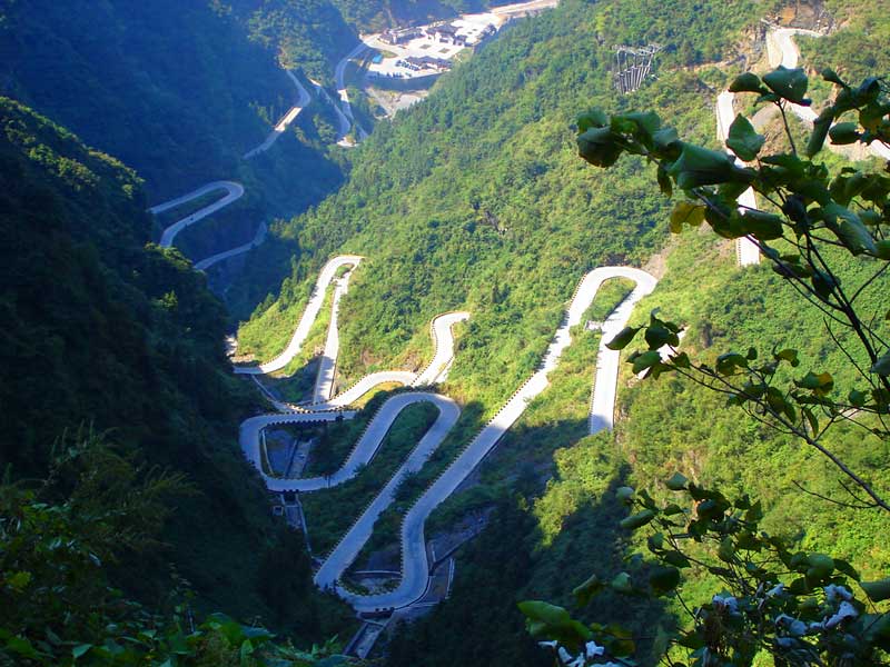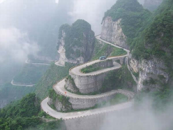 天門山盤山公路位于湖南省張家界市境內(nèi)的國家森林公園天門山上.天門山距張家界市區(qū)僅8公里,有湘西第一神山美譽(yù)。天門山盤山公路有“通天大道”之稱,盤山公路全長10.77公里,海拔從200米急劇提升到1300米,大道兩側(cè)絕壁千仞,空谷幽深,共計99個彎,180度急彎此消彼長,似玉帶環(huán)繞,彎彎緊連,層層疊起,直沖云霄。