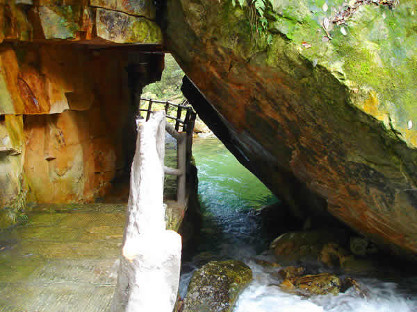 砂刀溝為一“U”形深谷,溝的東、西口依次位于金鞭溪畔的“千里相會”、紫草潭。該處奇峰兀立,林密苔滑。從溝中觀景,峰高天遠(yuǎn),澗深水清,充滿神話情趣,有“人間迷宮”之稱。如從“千里相會”入溝,逆時針方向沿溝而行,即可游后花園、迷魂臺、天下第一橋、天懸白練等景。