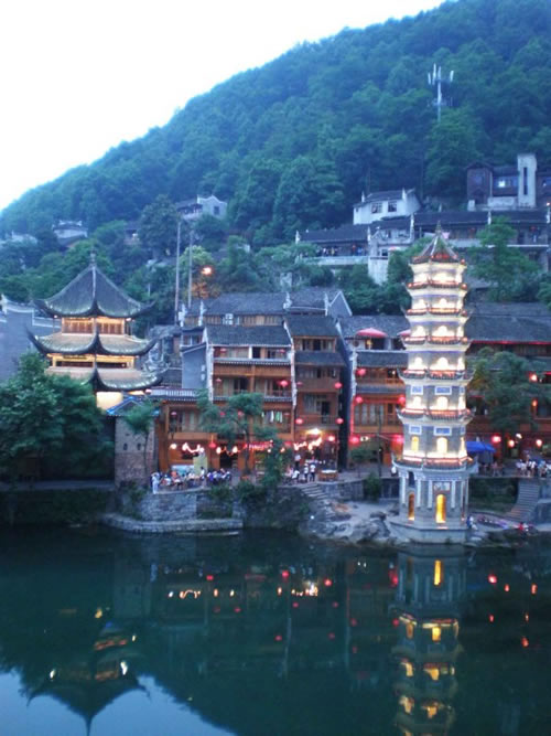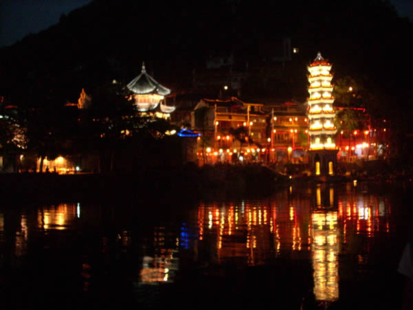 萬名塔夜景 為何要修筑這字紙爐,據(jù)說,乾隆五十年(1876年)古城擴(kuò)建了筆架城以后,形似筆架,故名“筆架城”,有了筆架峰,為培植風(fēng)水,便在沙灣黃土坎江邊修筑字紙爐寶塔一座,象一支筆,與筆架城相對應(yīng),意欲使鳳凰人文蔚起。