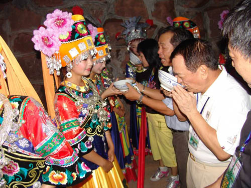 攔門酒 攔門酒是苗家山寨的一種古老的習俗,其中以叭咕苗寨最為盛行和最有特色。苗家娶親嫁女,親戚朋友都要上門送禮賀喜。好客的主人和賢惠大方的親朋戚友,總是要把這門喜事辦得體面熱鬧,同時也總是要借個良好的機會展示自己的富有,廣交朋友。主人把事先早已準備好的包谷燒酒,請來寨子里德高望重的族老和歌師,在自家的大門口擺下大方桌,桌子上擺滿了一碗碗噴著清香的美酒。客人來時,由主管把門的族老首先唱講賀詞,然后,客人中最年長且聲望高的長者唱答謝詞。 祝賀詞: 最尊敬的客人, 你們不怕旅途辛苦, 來到我們這個貧窮的地方, 山路雖然狹窄陡險, 總有你落腳的梯坎, 泥濘雖然臟滑, 青石板路平穩(wěn)而又閃光。 你們的到來, 給冷落的苗寨增添了無限的喜悅, 屋背后的錦雞, 它是歡迎你們這些尊貴的客人。 苗寨雖然偏僻貧寒, 但苗家個個都有一顆火熱的心腸。 沒有什么好地東西接待你們, 苗家的包谷燒酒格外甜蜜飄香。 攔門酒是苗家待客的最高禮節(jié), 請你們不要擔驚慌。 一碗酒是苗家的深深情意, 一碗酒是苗家獻給你的一顆火熱的心房。 喝了這甜蜜蜜的攔門酒, 你的臉上閃現(xiàn)出幸福的紅光。 喝了這碗香噴噴的攔門酒, 你的貴體將會更加健康強壯。 喝了這碗同心酒, 我們的心貼得更緊, 我們的友誼更加加深。 答謝詞: 最尊貴的主人, 你們的接待是這樣的周到, 你們的熱情是這么的執(zhí)著真誠。 我們雖然是遠方的陌生人, 到了這里卻親如一家人。 說什么苗鄉(xiāng)偏僻落后, 這里處處充滿了幸福的景象, 說什么苗鄉(xiāng)沒有什么上好的禮品招待, 友好的民族使我們體驗到了人間真正的友情。 包谷燒酒噴灑著撲鼻的芳香, 一陣陣溫暖了我們火熱的心房, 這是上好上好的禮品喲, 讓我們盡情意地品嘗。 紫竹林里的花錦雞, 聲聲叫得歡喲, 給苗寨帶來了幸福與吉祥。 我們遠方的客人今日來到苗寨, 為苗寨帶來歡樂與安康。 接過一碗碗香噴噴的包谷燒酒, 讓我們共同痛飲品嘗, 苗寨的好日子濃似包谷燒酒, 我們的友情啊地久天長。 祝賀詞和答謝詞之后,主人把早已想好了的農(nóng)事或家事其日常生活的要事向來客提問,接謝人隨問隨答,然后由族長十分恭敬地雙手舉起盛滿包谷酒的酒杯,遞給一個年長客人,一碗一碗地讓客人們喝下這香醇美的包谷燒酒。一切儀式做完之后,說聲:“得罪了,最尊貴的客人”,客人答一聲“請不要客氣,我們都是一家人”。這時,酒門大開,攔門人很禮貌地讓開一條道路恭迎客人進屋。 攔門酒的習俗十分原始古老,它體現(xiàn)了苗家禮貌待客坦誠交友的良好道德風范。 |